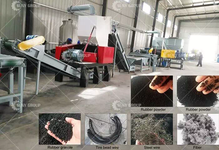 Waste rubber, particularly waste tyres, contains steel wires, fibres, and multi-layered composite structures. It must undergo systematic processing through graded treatment to achieve efficient recycling. Current waste rubber processing lines typically comprise multiple stages, including crushing, pulverising, sorting, and fine grinding. By progressively reducing material size and continuously removing impurities, the process ultimately yields high-purity rubber granules or rubber powder. Depending on the intended applications, processed materials can be utilized in recycled rubber products, rubber flooring, sports surface materials, or as rubber modification fillers, enabling high-value resource utilization.
