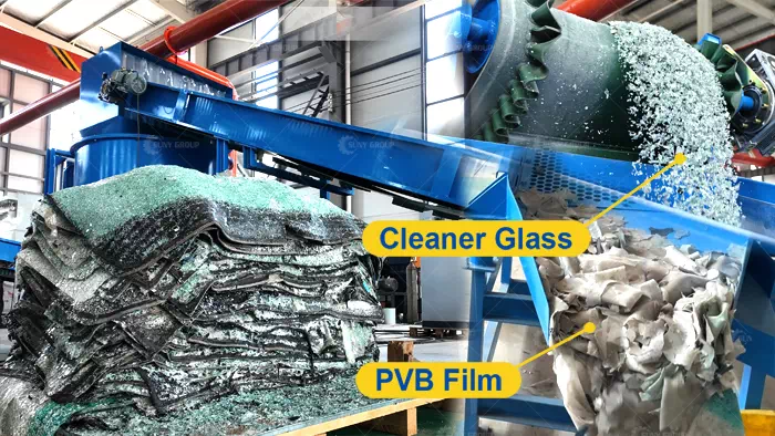 With the widespread application of automotive windshields and architectural safety glass, the issue of recycling laminated glass waste has become increasingly prominent. Traditional methods often struggle to efficiently separate glass from PVB interlayers, resulting not only in low recycling value but also in potential secondary pollution. Addressing this challenge, SUNY GROUP's laminated glass recycling equipment employs physical fragmentation and high-efficiency sorting technology to achieve effective separation of glass and PVB, providing a stable and reliable solution for resource reuse.